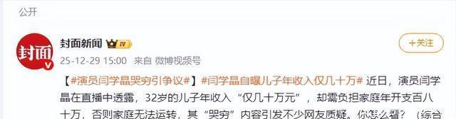 直播卖惨 2025年12月27日,本是正常的直播带货,或许是为了让粉丝多下单。 闫学晶开始哭诉,她说自己的儿子一年只能挣二三十万,儿媳还不足十万。 小俩口又要还房贷,还要养孩子,一年开销怎么也得百八十万。 她的一番言论引起了巨大的舆论热潮。