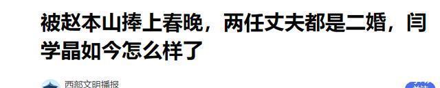 被恩师捧红 闫学晶的走红离不开赵本山的扶持。 2001年第一次上春晚的她,与潘长江合作小品《三号楼长》。 打磨了几个月的剧本,却因为上个节目的超时,被导演临时告知取消。