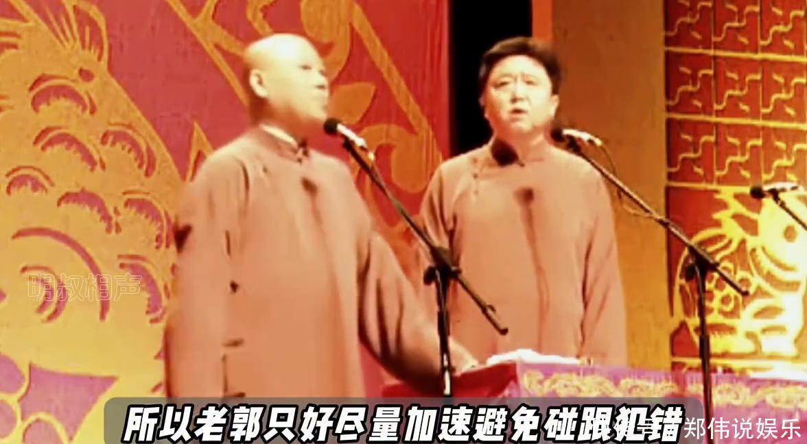 他早年风格犀利,现挂极多。他的相声就像一场密集的话术风暴,早年的搭档里有人反应不及时,像在台上听相声有人爱抢话,对词总会打乱节奏,一句话没接住整段相声就垮了。所以老郭只好尽量加速避免捧哏犯错。
